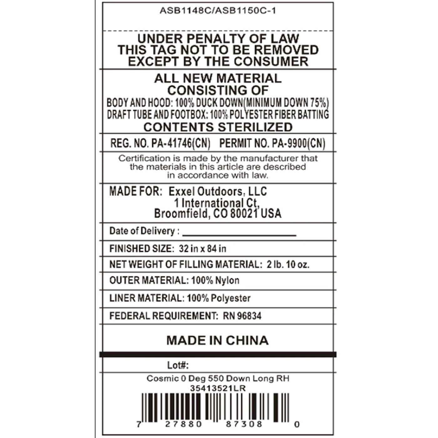 - Insulation: 550FP Duck Down
