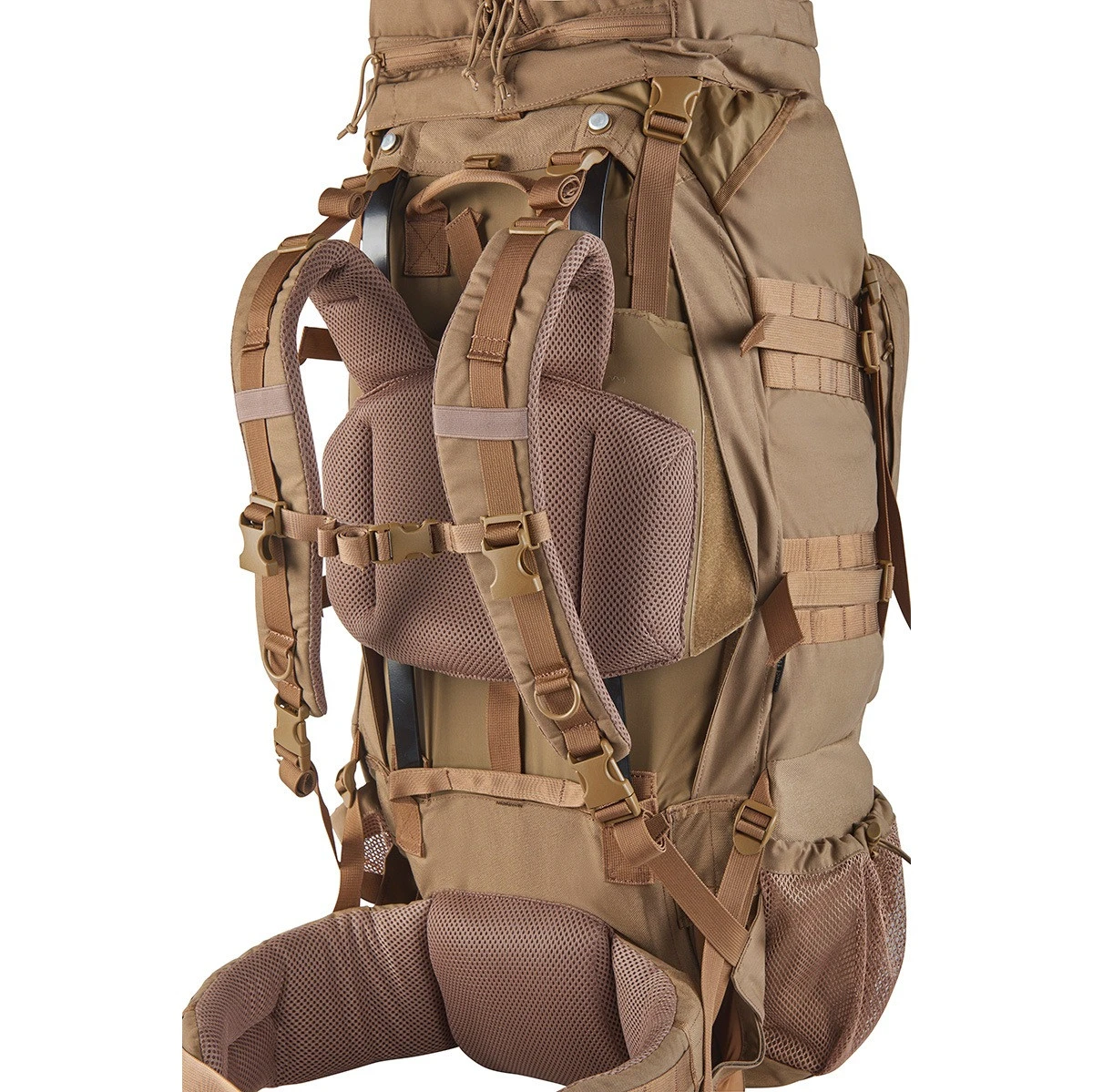 - Coyote Brown pack has desert tan and white raincover